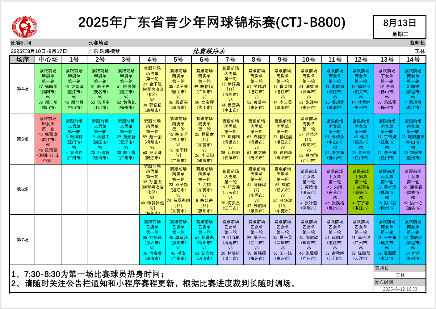 预计13日上午开始将陆续进行混双、团体赛9场颁奖。赛事结果将更新至广东省社会体育和训练竞赛中心官网及“网球记赛事”微信小程序。