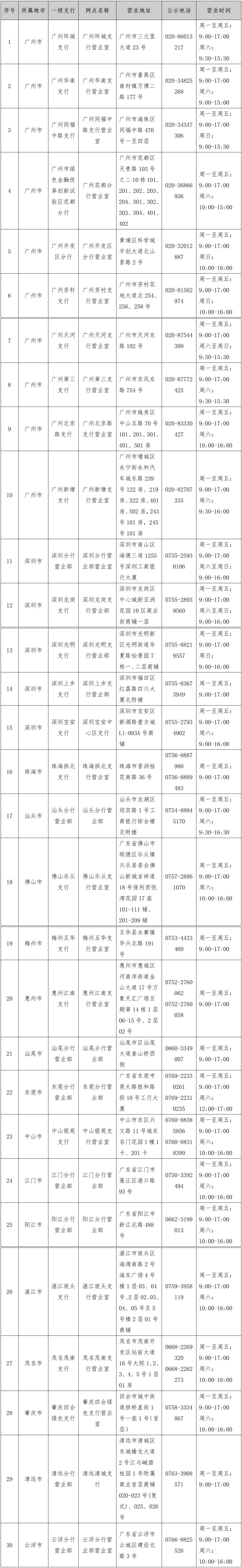 中国工商银行30家网点信息(仅销售广东赛区门票)