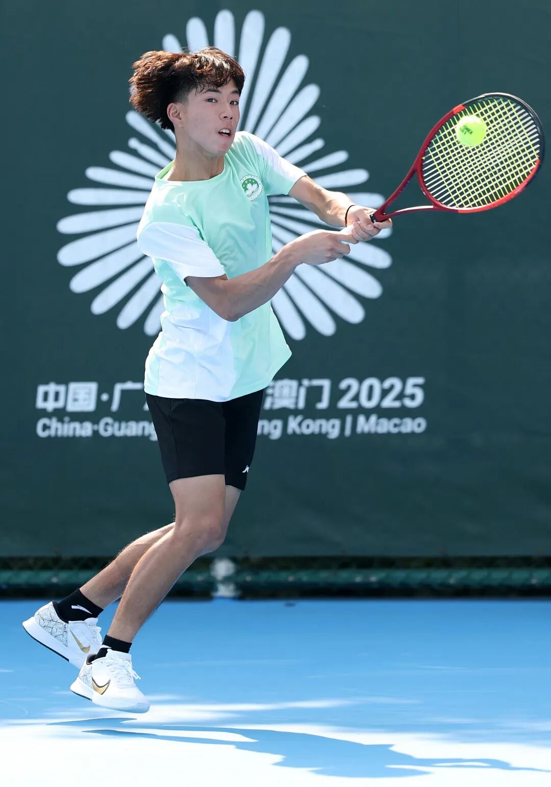 澳门队选手何锶朗在单打比赛中回球。他0比2不敌湖北队选手丁川。最终,澳门队0比2不敌湖北队,无缘下一轮。