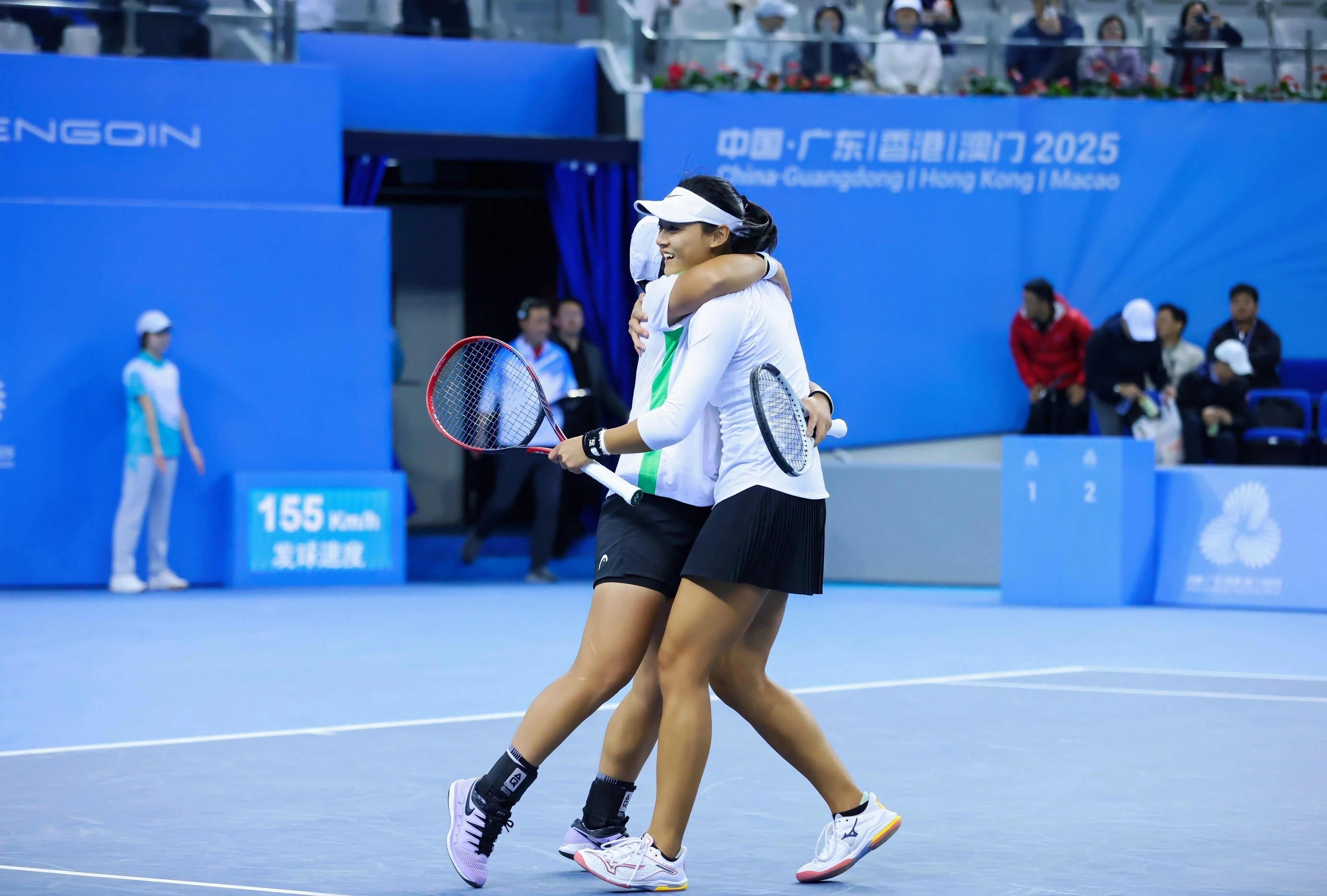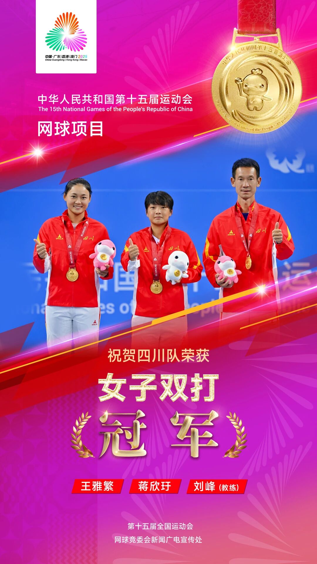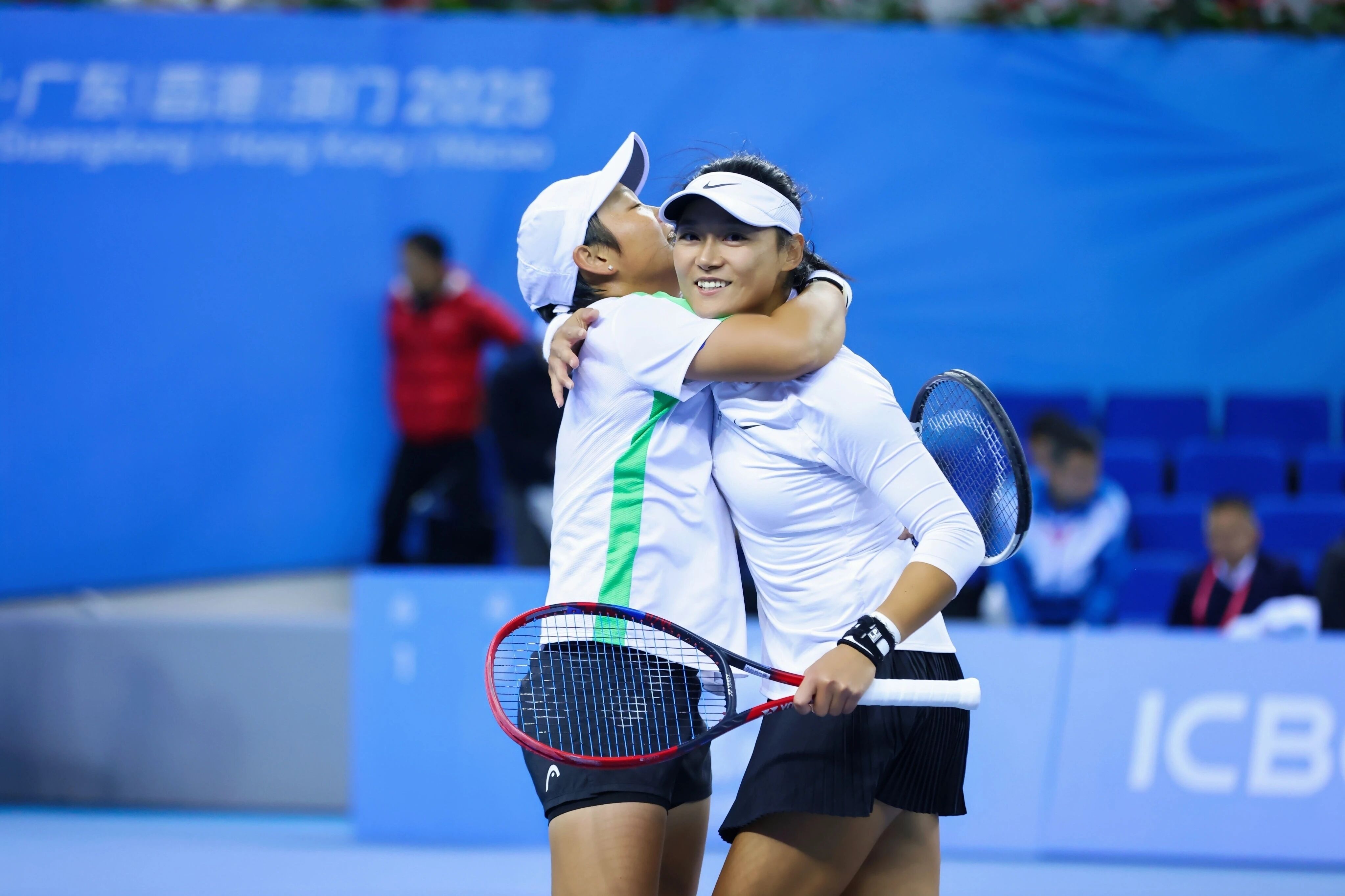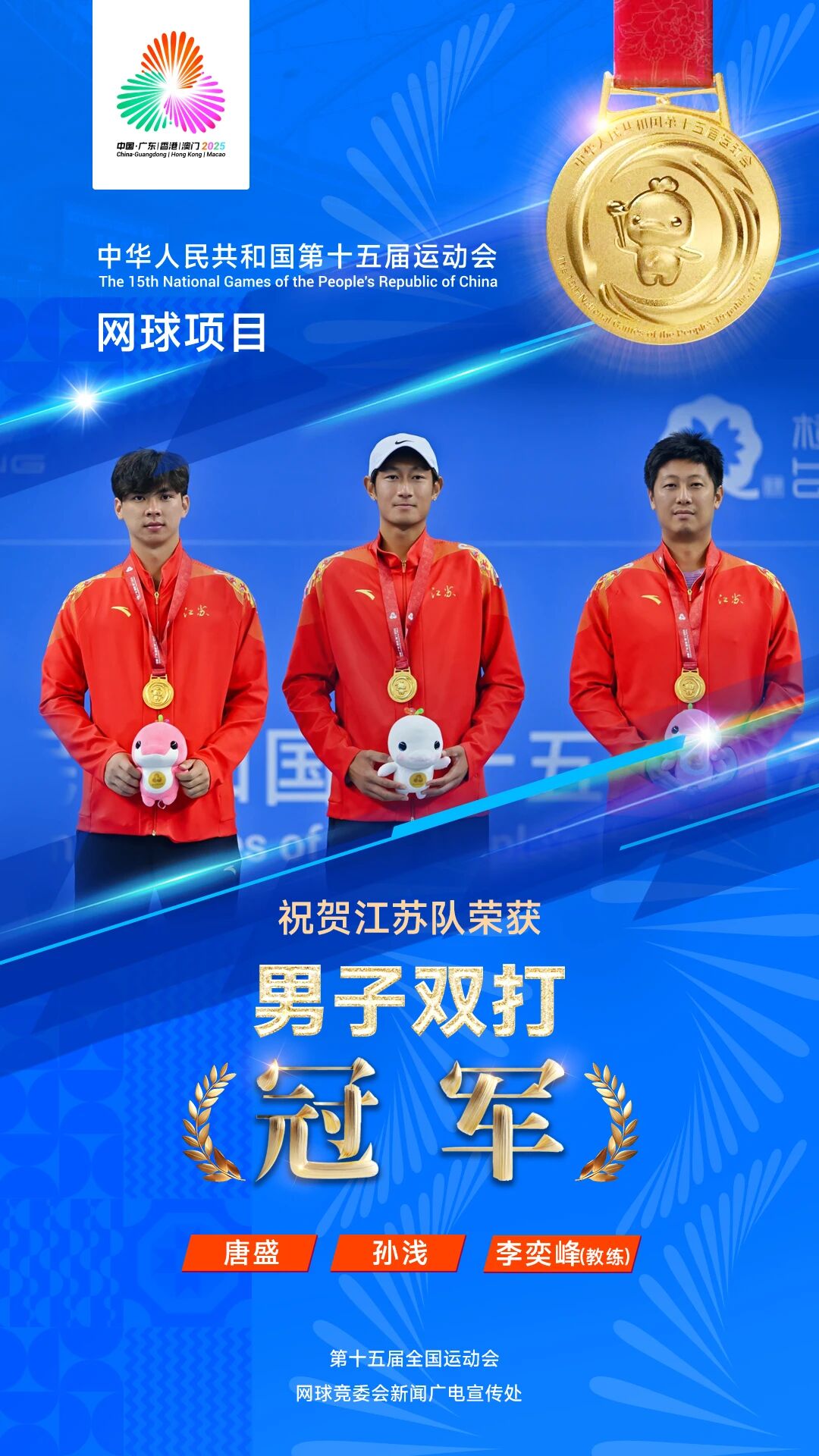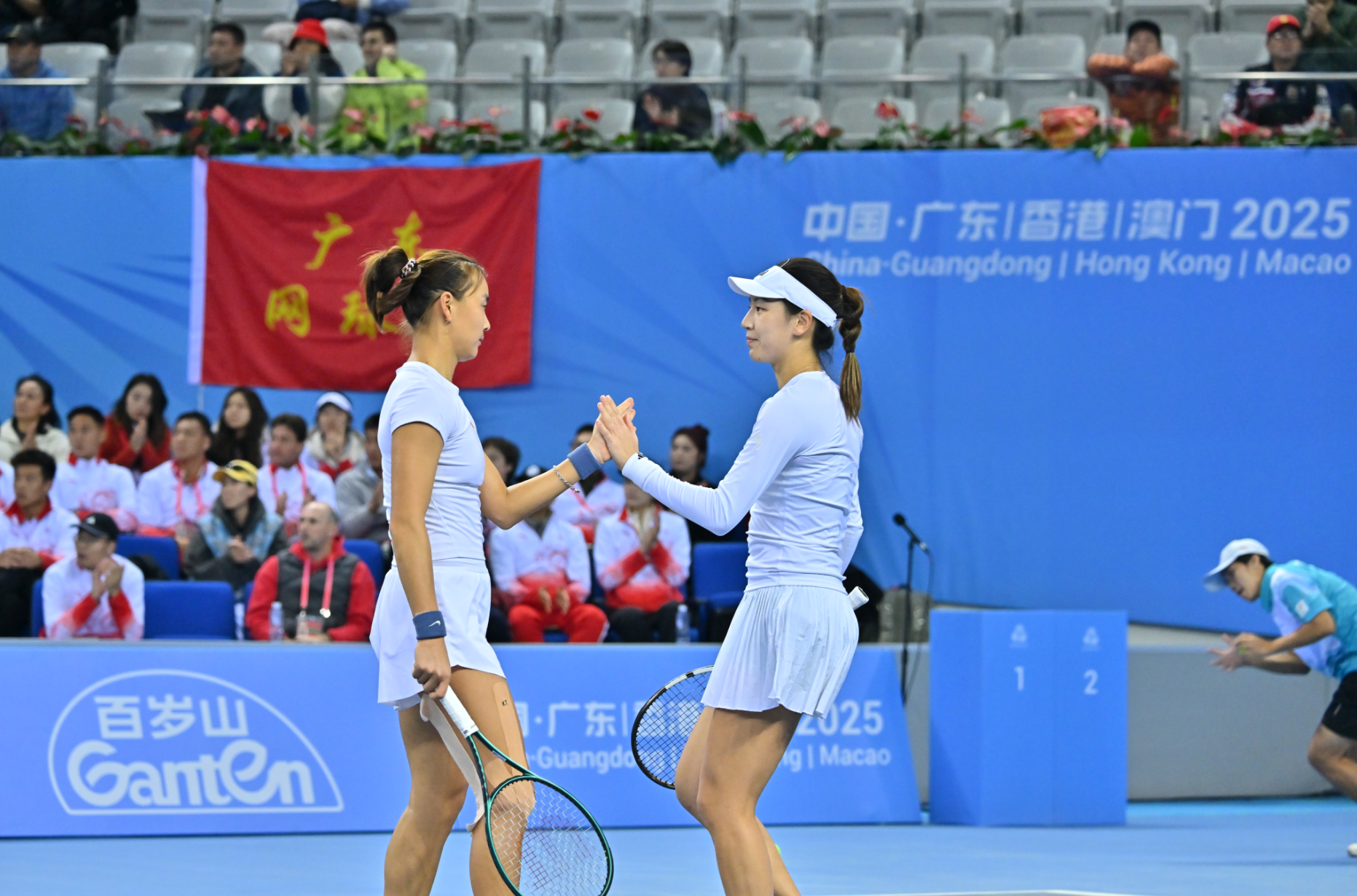 11月19日,十五运会网球项目在横琴国际网球中心展开了双打决赛的争夺,江苏组合唐盛/孙浅、四川组合王雅繁/蒋欣玗分别获得男双、女双金牌。