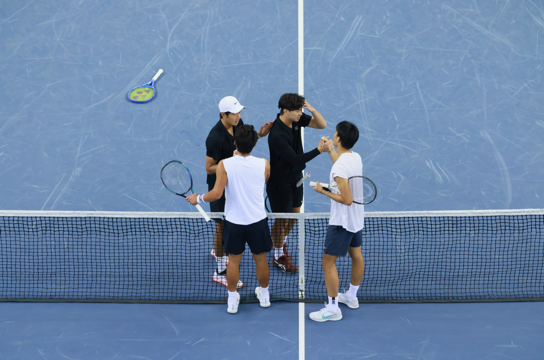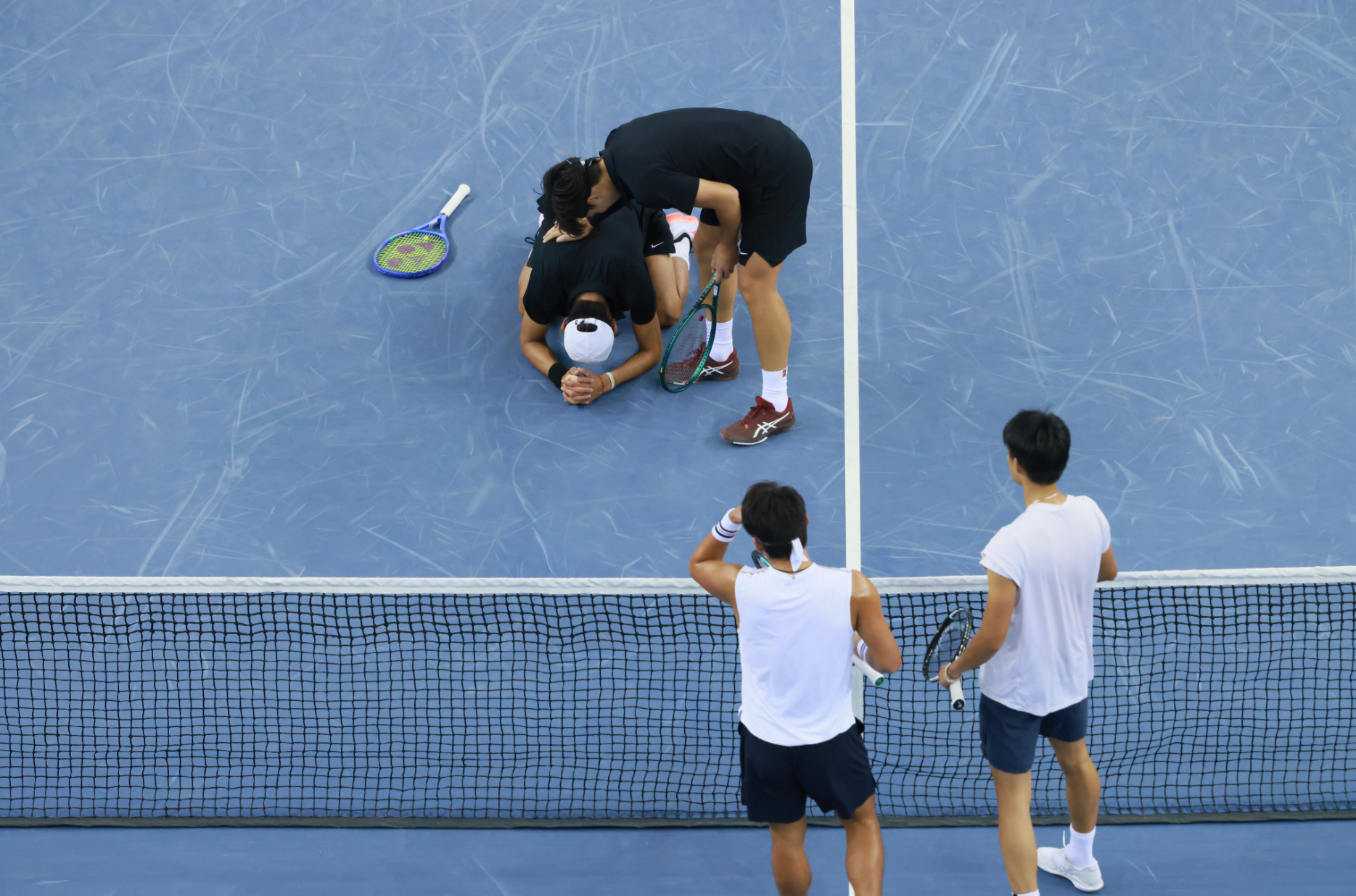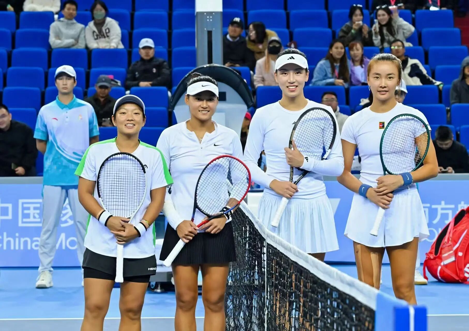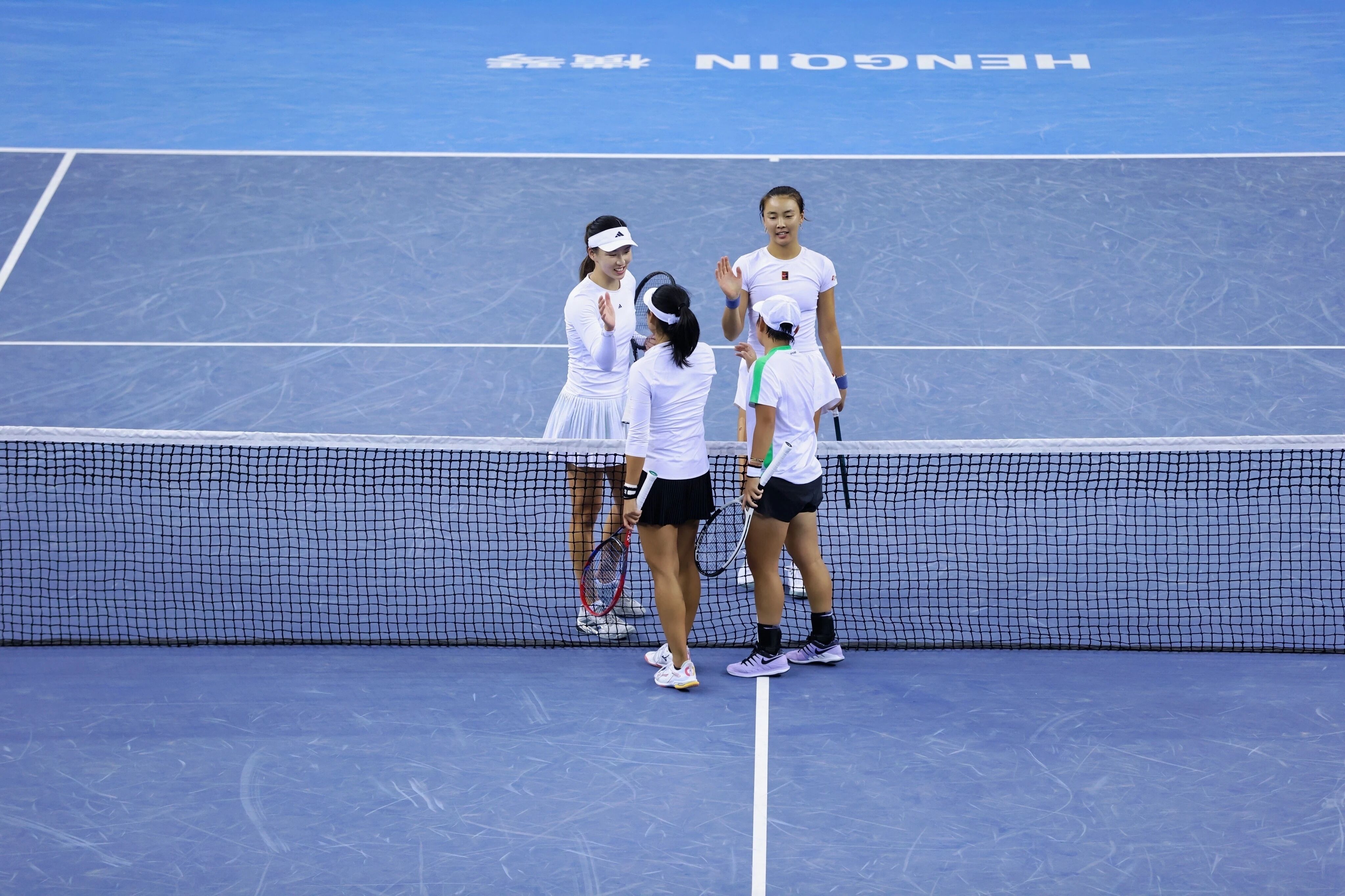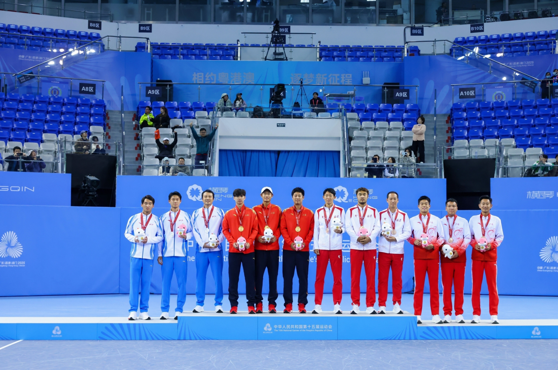 11月19日,十五运会网球项目在横琴国际网球中心展开了双打决赛的争夺,江苏组合唐盛/孙浅、四川组合王雅繁/蒋欣玗分别获得男双、女双金牌。