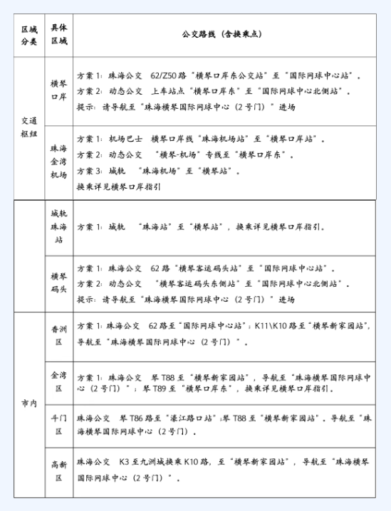 赛期乘坐网约车/出租车,输入目的地至“横琴网球国际中心”,到指定上下车点,其它区域禁止停车。(返程请至“网约车上下车点”乘车)。