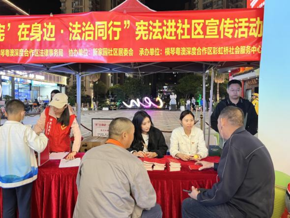 在充分考虑上班族等归家较迟等因素基础上,法律事务局联合各社区居委会等,分别在新家园社区、莲花社区、小横琴社区和荷塘社区开展了“宪法进社区”夜市活动,通过夜市充分动员社区居民学法尊法,有趣又新颖的游戏环节受到社区居民的喜爱。针对社区群众法治需求和关注的法律问题,现场律师和工作人员用通俗易懂的语言为居民们详细解答,并派发宣传手册,推动宪法学习深入社区、走入群众。