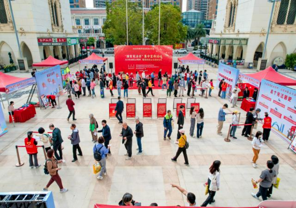 宪法是国家的根本法,是治国安邦的总章程。2023年12月4日是第十个国家宪法日,也是我国现行宪法颁布施行四十一周年。为学习宣传贯彻党的二十大精神,大力弘扬宪法精神,建设社会主义法治文化,在2023年“宪法宣传周”期间,横琴粤澳深度合作区法律事务局(下称法律事务局)统筹相关单位开展“1+5+2”系列宪法宣传活动,通过“宪法集中宣传”“宪法进单位”“宪法进校园”“宪法进社区”“宪法进口岸”“宪法进驿站”“宪法进网络”以及“宪法精神点亮城市地标”等一系列宣传推广活动,在横琴粤澳深度合作区形成了热烈的宪法宣传和学习氛围,进一步增强宪法意识、弘扬宪法精神、维护宪法权威,推动宪法知识家喻户晓、宪法理念深入人心。