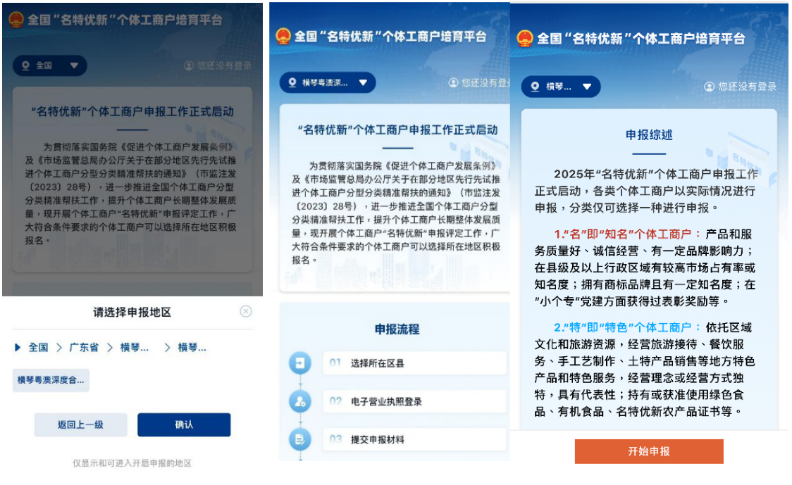 为贯彻落实《促进个体工商户发展条例》,提升横琴粤澳深度合作区(以下简称合作区)个体工商户发展质量,按照《广东省市场监督管理局办公室关于开展2025年“名特优新”个体工商户认定工作的通知》相关要求,合作区2025年“名特优新”个体工商户申报工作现已正式启动。符合条件的个体工商户可通过全国“名特优新”个体工商户培育平台进行自主申报。经审核认定后,申报主体将获得“名特优新”个体工商户称号并享受相关帮扶政策。欢迎广大个体工商户积极申报。