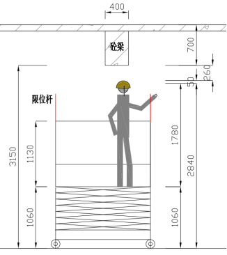 2.涉事作业在收起状态下固定平台的距地高度1060mm,平台护栏的距地高度2190mm;涉事结构梁底面的距地高度3150mm,此处无消防工程作业面(详见图2、图3)。