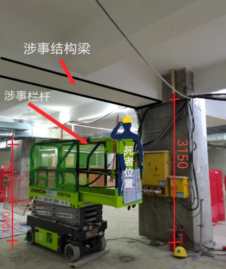 3.死者身高1780mm,模拟戴安全帽后头顶距梁底260mm。
