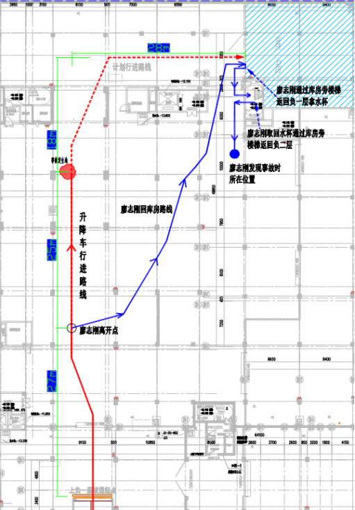 14时10分许,廖某才电话通知陈某杰,要求陈某杰、廖某刚停止前往施工点,将涉事剪叉式高空作业平台(以下简称涉事作业平台)送回库房充电。廖某刚携带其他工具先行抵达库房,通过库房旁楼梯前往负一层取水杯,因再次返回库房时未见陈某杰和涉事作业平台,廖某刚在库房附近寻找,发现涉事作业平台停靠在负二层SB1-9轴交SB1-B轴处,陈某杰头颈部被涉事作业平台护栏(处于升起状态)和涉事结构梁挤压,鼻腔、口腔出血。廖某刚立即返回库房请求贝某通等工友参加救援,工友们抵达现场后,廖某刚将涉事作业平台降下(行进路线详见图1)。