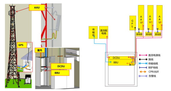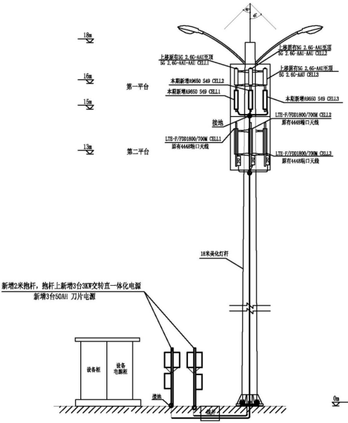 涉事作业为通信领域的安装、调测作业,具体内容为:利用原有18m美化灯杆,在作业平台将原有2.6G-AAU设备同抱杆上移至顶,腾出空间新增本期4.9G-AAU设备,安装位置如图1所示,AAU设备就近做好防雷接地。