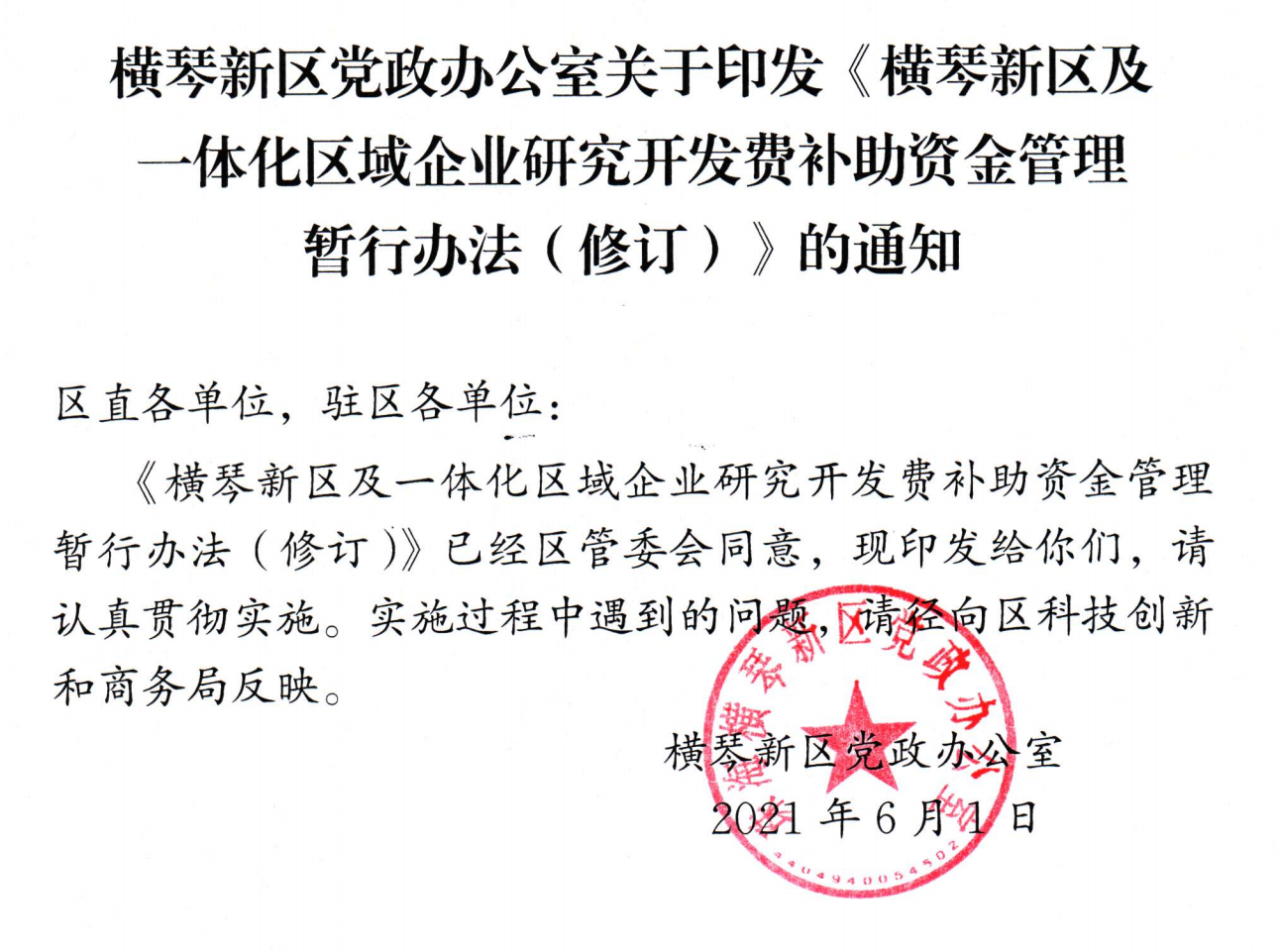 横琴新区党政办公室关于印发《横琴新区及一体化区域企业研究开发费补助资金管理暂行办法(修订)》的通知