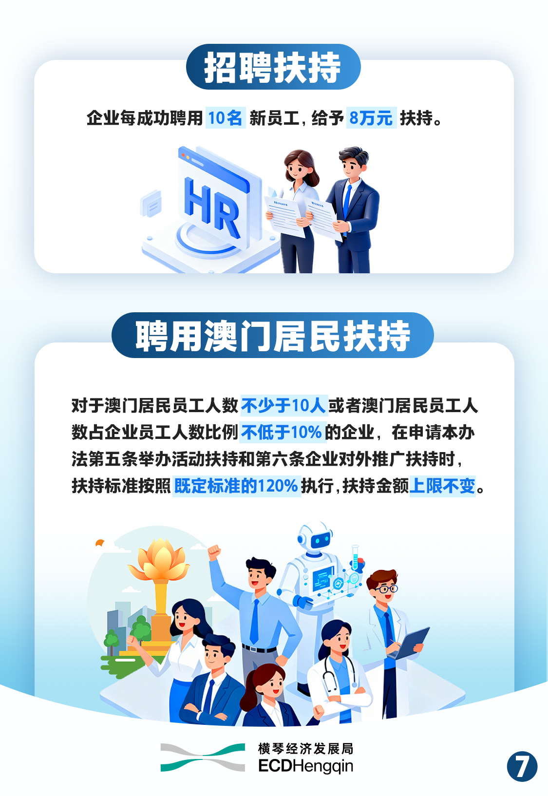 为支持更多澳门居民在合作区就业,《扶持办法》明确对于澳门居民员工人数不少于十人或者澳门居民员工人数占企业员工人数比例不低于百分之十的企业,在申请本办法第五条举办活动扶持和第六条企业对外推广扶持时,扶持标准按照既定标准的百分之一百二十执行。