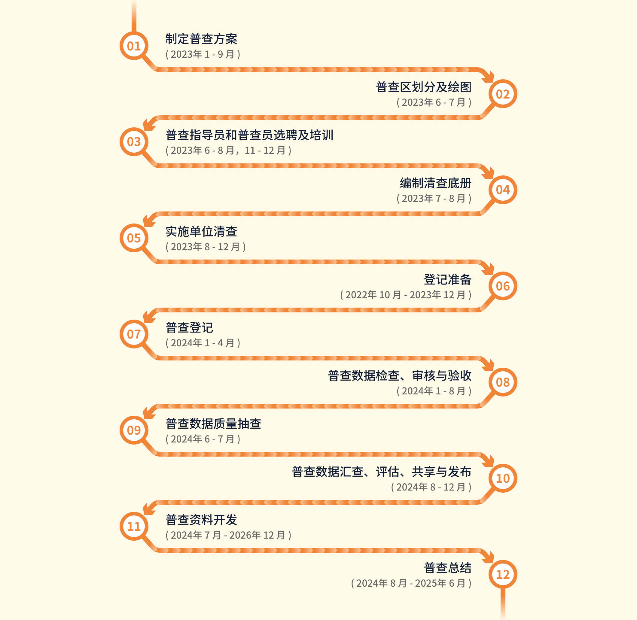 普查的业务流程主要包括:制定普查方案,普查区划分及绘图,普查指导员和普查员选聘及培训,编制清查底册,实施单位清查,登记准备,普查登记,普查数据检查、审核与验收,普查数据质量抽查,普查数据汇总、评估、共享与发布,普查资料开发及普查总结等12个环节。