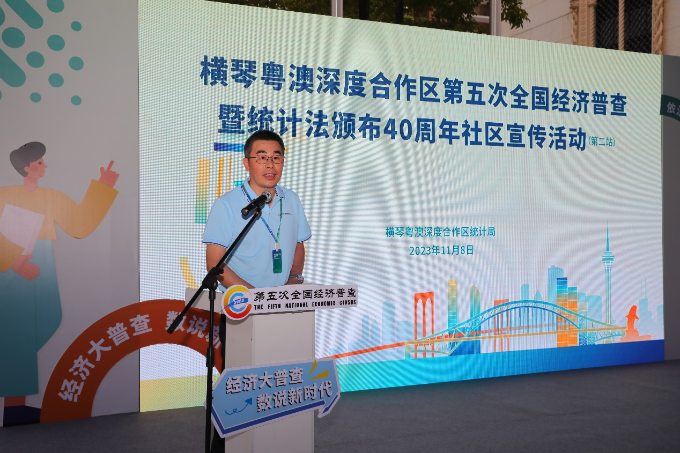 2023年11月8日下午,横琴粤澳深度合作区统计局在横琴励骏庞都广场中庭举办合作区第五次全国经济普查(下称“五经普”)暨统计法颁布40周年普法宣传社区活动,为正在全面铺开的合作区五经普工作摇旗鼓劲,动员全民支持参与,合作区经普办主任、统计局局长李国辉,经普办副主任、统计局副局长李秉勋,合作区小横琴社区党委副书记罗晓琪、莲花社区党委副书记梁洪坚、新家园社区党委委员薛寒冰及荷塘社区代表、横琴海上名珠餐饮有限公司、珠海大横琴发展有限公司等多家企业代表出席。