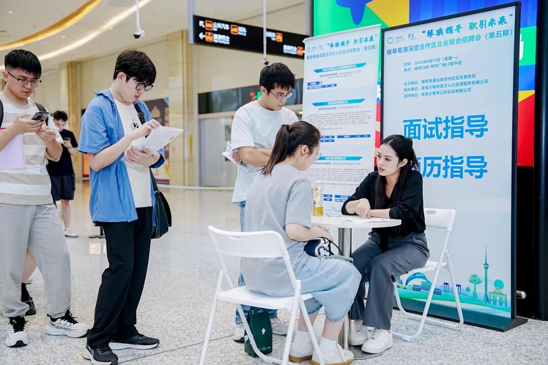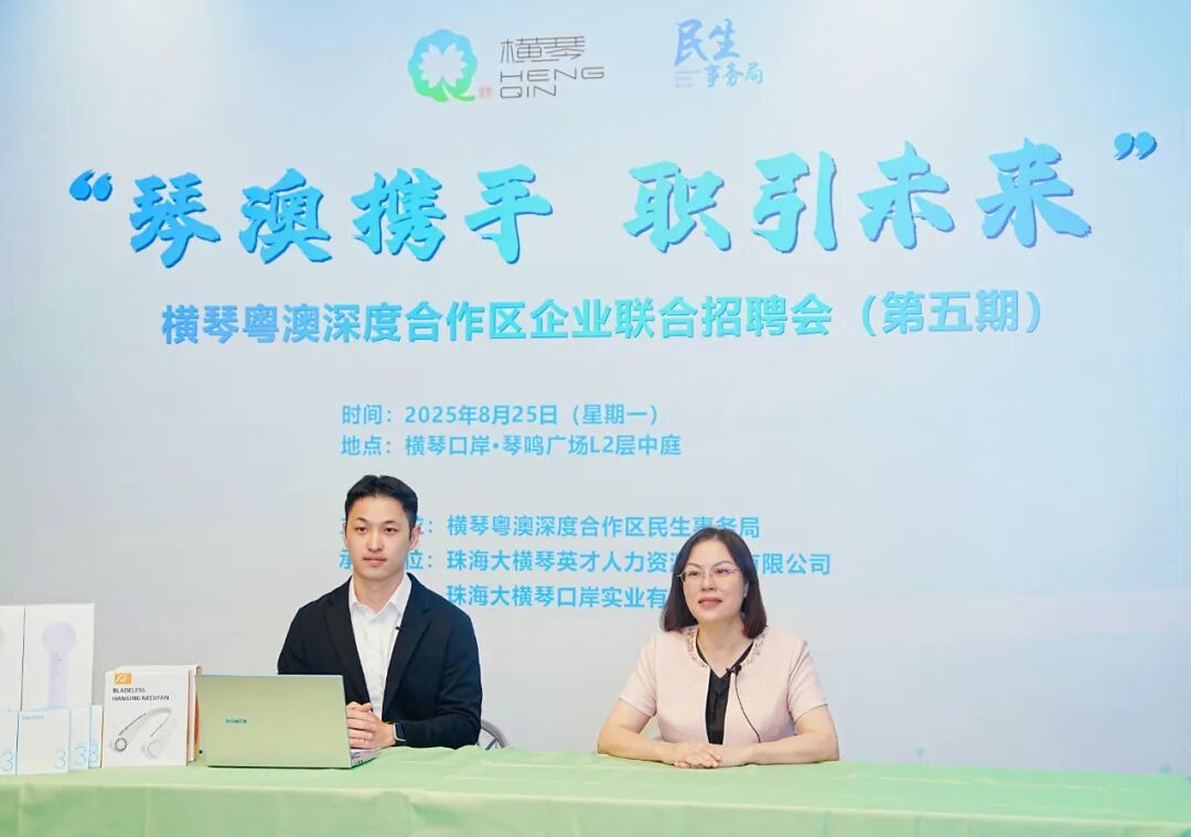 “琴澳携手 职引未来” 合作区企业联合招聘会(第五期) 在横琴口岸成功举办 本次活动采取“线下招聘+线上直播带岗”形式,由珠海横琴路坦信息服务有限公司、珠海澳大科技研究院、广东丸美生物医学有限公司等50家合作区优质企业提供369个岗位、770余个职位空缺,涵盖科技研发、中医药、现代金融、文旅会展等合作区“四新”产业领域,吸引来自澳门和内地众多求职者的高度关注和积极参与。 本次招聘会由珠海大横琴英才人力资源服务有限公司承办,珠海大横琴口岸实业有限公司支持协办。为全面服务企业和求职者,除线上线下设有招聘专区外,现场还特别设置面试和简历指导专区以及政策咨询专区,吸引了近百名求职者排队咨询。 线上直播带岗环节,合作区民生事务局副局长许凤梅走进直播间,向观众介绍合作区的战略定位、营商环境及区位优势,并与线上观众积极互动。 她强调,建设横琴粤澳深度合作区是中央的一项重大战略部署,习近平总书记先后五次来到合作区考察,指出“澳门+横琴”正在成为丰富“一国两制”实践的新示范。她还重点介绍了由合作区民生事务局与澳门劳工事务局携手搭建的“澳门居民招聘专区”,为澳门青年提供一站式合作区生活资讯和就业服务。目前该平台已发布近140个岗位、超300个职位空缺,希望来自澳门的求职者们多多关注,把握机遇、勇敢尝试,在合作区开启职业生涯新篇章。 此后,艾威药业(珠海横琴)有限公司、三一南方总部大厦等多家合作区企业代表陆续走进直播间,详细讲解企业背景、岗位晋升通道及当前招聘需求,并实时为参与直播的观众答疑解惑。直播带岗专区累计吸引超2.3万人次观看,互动气氛热烈。 许凤梅还在招聘会现场走访企业展位,与企业代表面对面交流,关切询问企业的招聘岗位详情、人才录用流程及现场简历收取情况等,并祝愿企业招聘到心仪的人才。 来自珠海原妙医学科技股份有限公司的招聘经理说道: 今天现场人很多,我们收到了不少简历,接下来会跟进面试等后续招聘流程,未来我们也希望能继续参加合作区举办的此类活动。 广东卡斯商业管理有限公司的人事行政主管表示: 此次招聘会组织得力,流程顺畅,从前期报名到招聘现场工作人员都提供了全面的协助,感谢合作区民生事务局为企业搭建的招聘平台,为我们招揽人才提供了新路径。 参与直播带岗的艾威药业(珠海横琴)有限公司人力专员认为: 这次线下+线上的招聘形式很新颖,我们可以通过直播在线向求职者介绍企业的基本情况和岗位需求。有的求职者看了我们的直播后就来现场摊位投递简历了,很感谢主办方为我们提供了多元的招聘形式。 居住在合作区的澳门居民黄女士说: 我很希望能在横琴就业,横琴的就业环境很好,在家门口就能求职,非常便利,还有直播渠道供无法到场的朋友投递简历,希望今天大家都有所收获。 据统计,截至8月25日17时,合作区企业现场共收取简历632份,其中澳门居民简历29份,现场初步达成就业意向近180人次;直播带岗专区共收取简历952份。 温馨提醒: 线上简历投递将开放至8月29日,欢迎求职者关注和投递心仪的岗位! 下一步 合作区民生事务局 将继续以企业和求职者需求为导向 不断拓展 “琴澳携手 职引未来” 品牌招聘活动的内涵与形式 进一步打通人才供需双向通道 全面提升合作区公共就业服务的 专业化、精细化水平 为合作区高质量发展持续注入动能 助力琴澳融合迈向新阶段