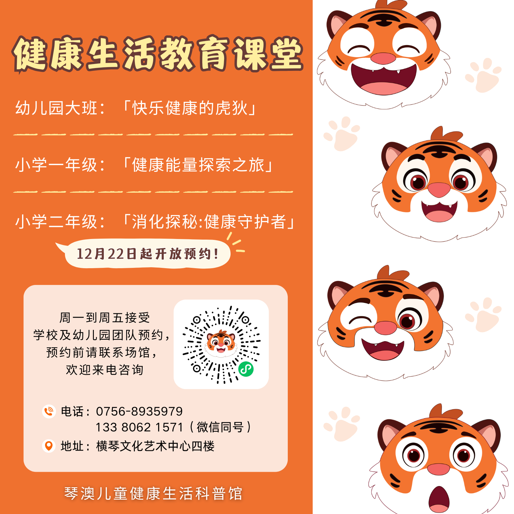 为让琴澳儿童更深入认识健康生活知识,琴澳儿童健康生活科普馆自2025年3月8日起面向各校(园)开放幼儿园大班和小学一年级的健康生活教育课程,并自2025秋季学期起,为预约学校提供车辆接送和一日意外险服务,进一步便利琴澳师生参与课程。