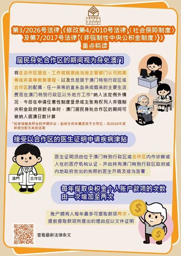 本次修法的重点之一,在于明确将澳门居民身处横琴粤澳深度合作区的特定情况,包括将在合作区居住、工作或就读由当地主管部门认可的高等或非高等教育课程,以及因负担居于合作区的亲属主要生活费而在澳门以外地方工作等原因,纳入法定例外情况,以便在处理上述两项社保权益时,澳门居民身处合作区的期间可视为身处澳门。